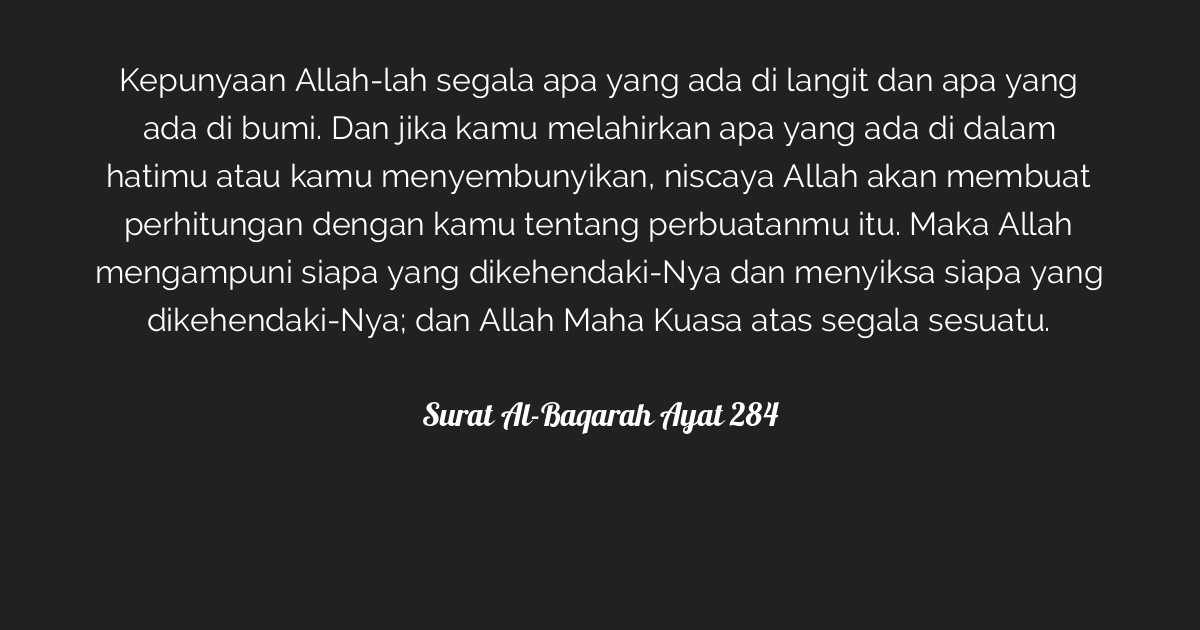 Dalam surat al baqarah ayat 286 bermakna bahwa manusia tidak akan diberi beban kecuali sesuai kemampuannya. Surat al baqarah ayat 286. Jika kamu nyatakan apa yang ada di dalam hatimu atau kamu sembunyikan, . Surat ini terdiri dari 286 ayat. لِلّٰهِ مَا فِى السَّمٰوٰتِ وَمَا فِى الْاَرْضِ ۗ وَاِنْ تُبْدُوْا مَا فِيْٓ اَنْفُسِكُمْ اَوْ تُخْفُوْهُ يُحَاسِبْكُمْ بِهِ اللّٰهُ ۗ . يُحَاسِبْكُمْ بِهِ اللّٰهُۗ · dan mengazab.